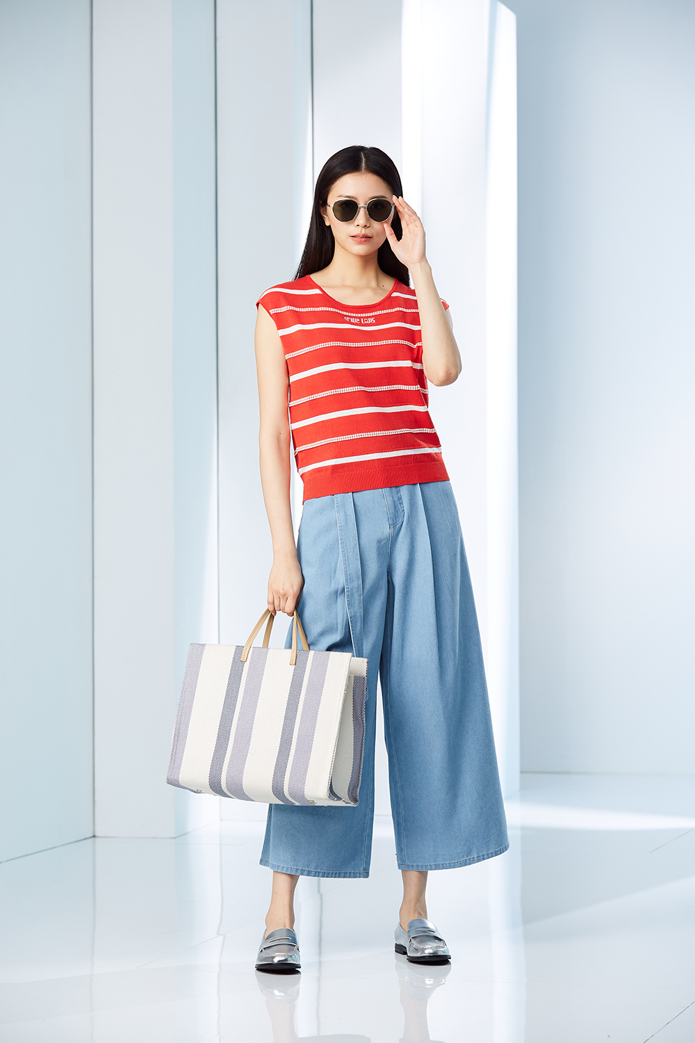 立體織紋變化條紋,品牌LOGO刺繡針織上衣。