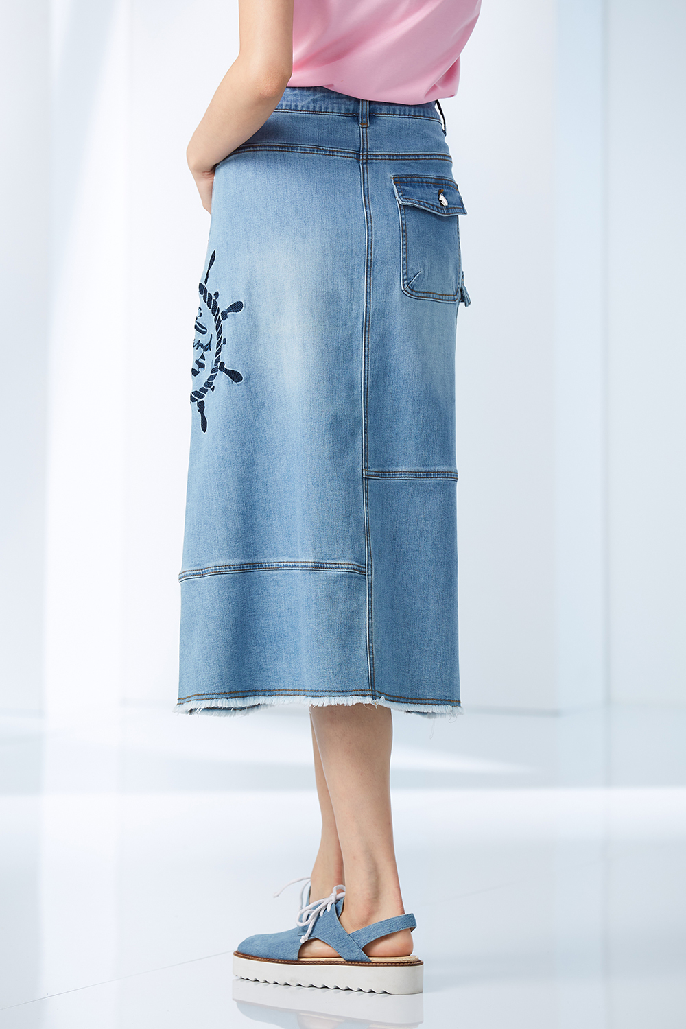 水洗藍解構刺繡拼接牛仔裙,撞色壓線加上拼接設計,刺繡細緻可愛,是一條非常百搭的長裙。
