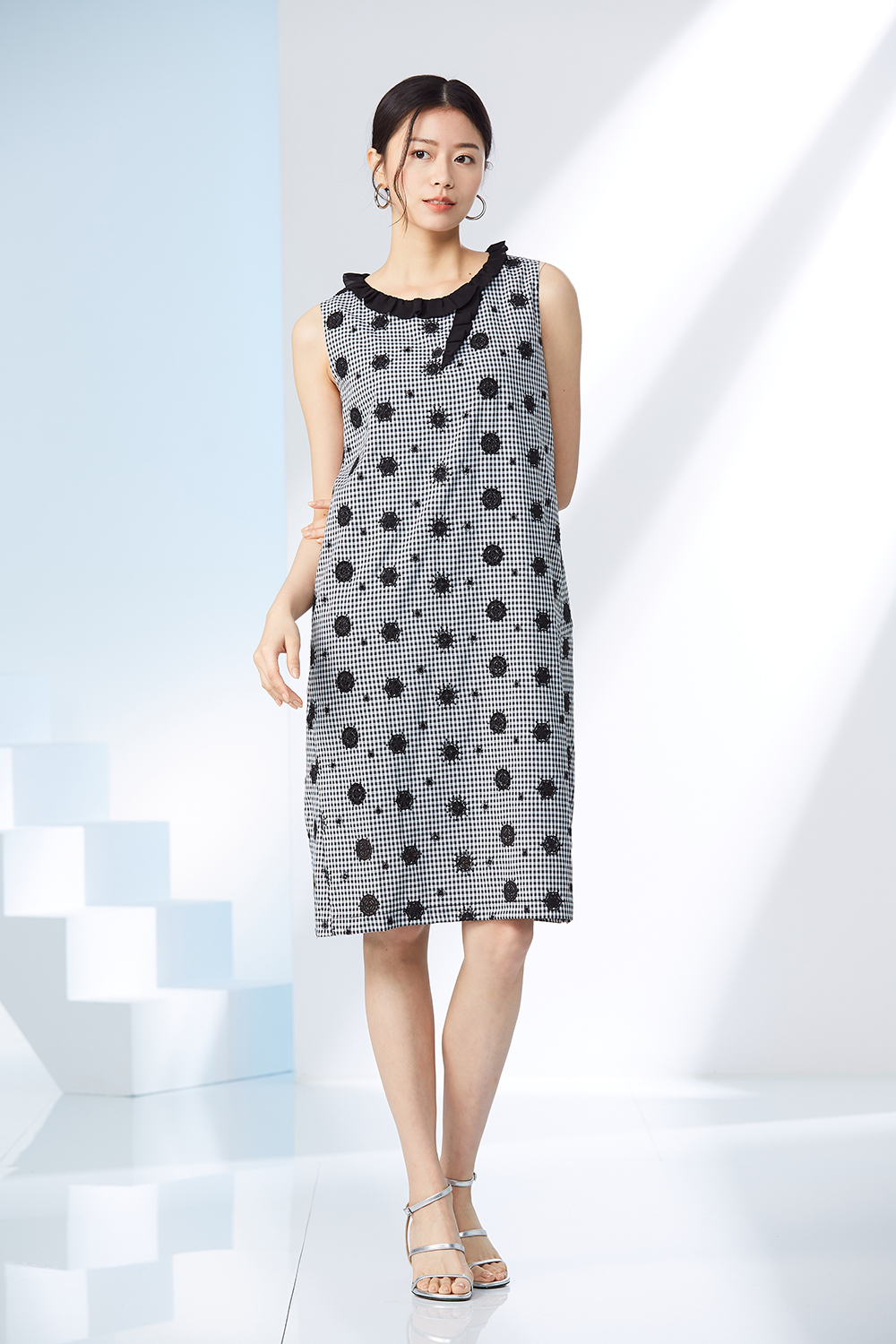 無袖寬鬆版型,黑白細格加簍空刺繡。