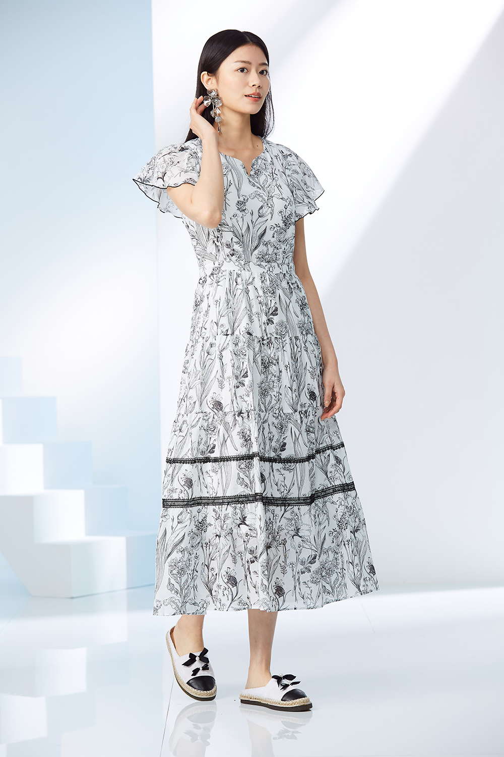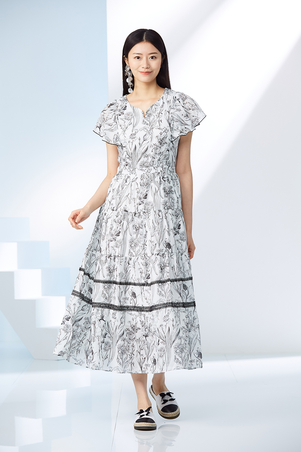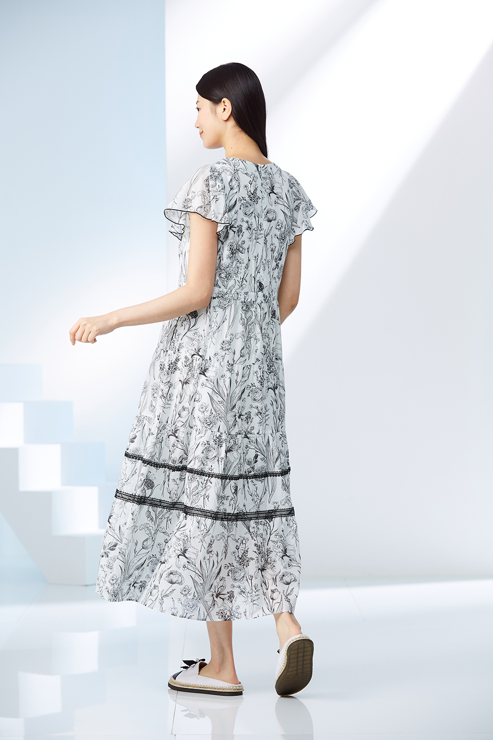 多層次剪接,裙襬拼接蕾絲洋裝。