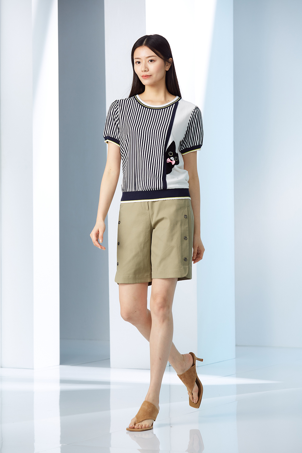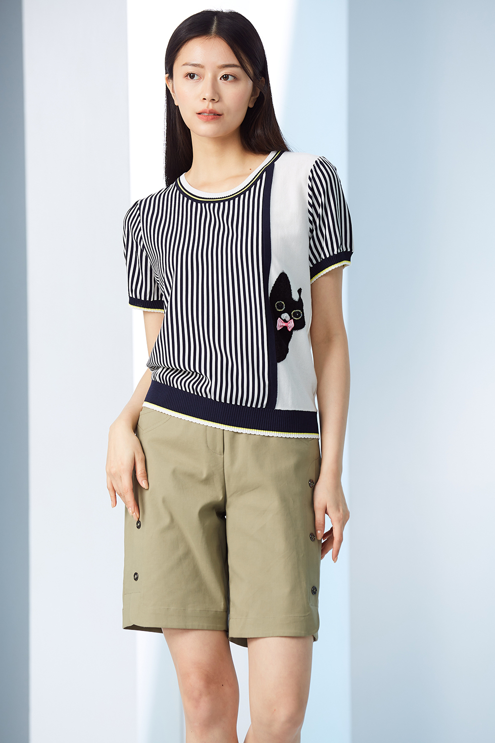 條紋印花拼接,小貓嵌花配色針織上衣。