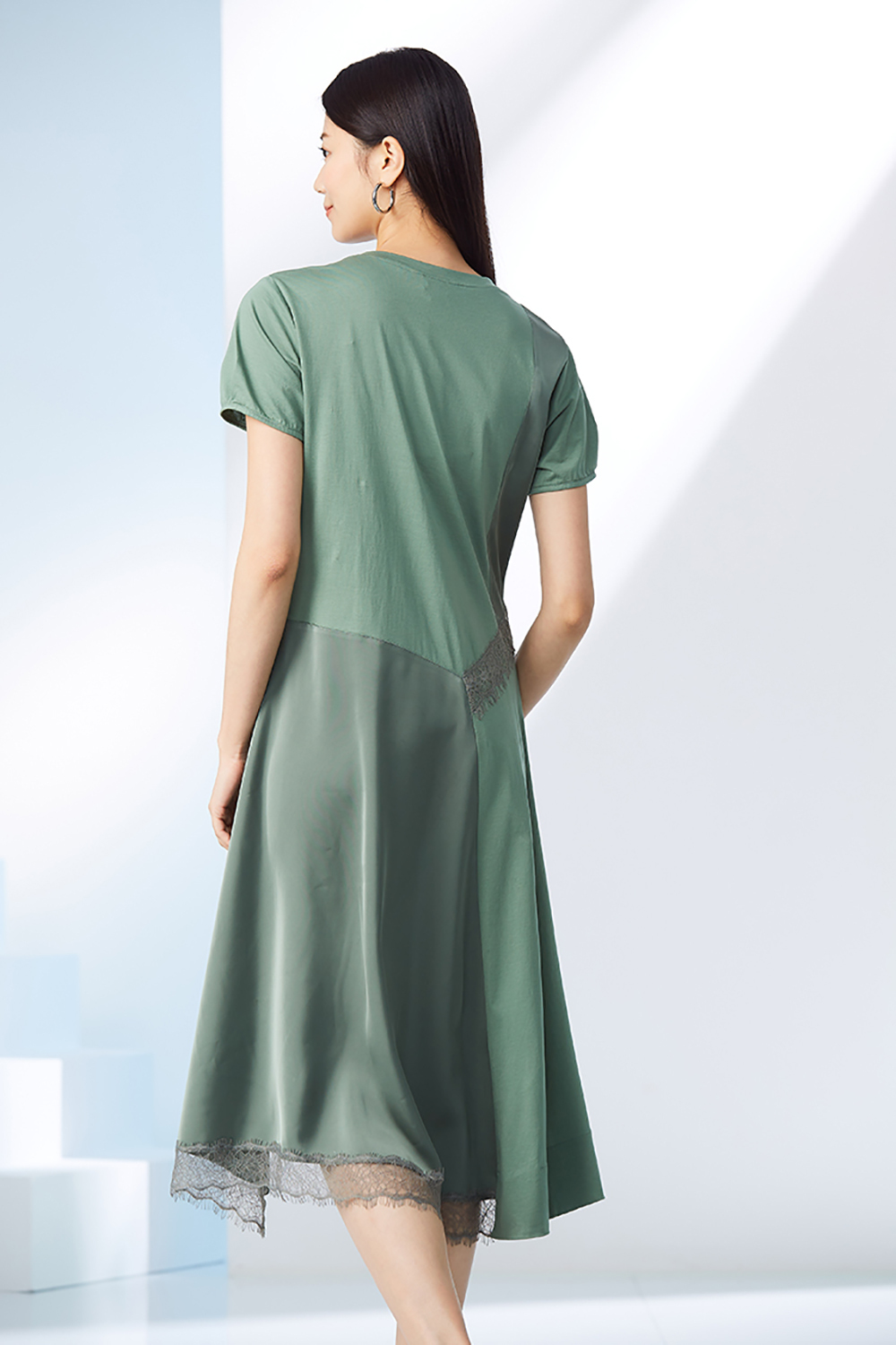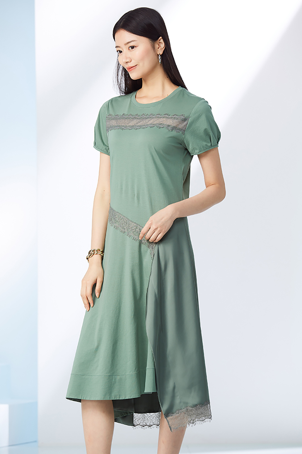蕾絲拼接,不對稱傘狀裙擺洋裝。