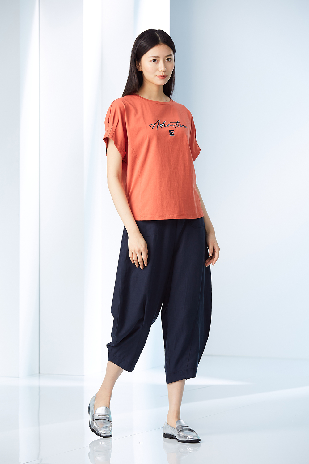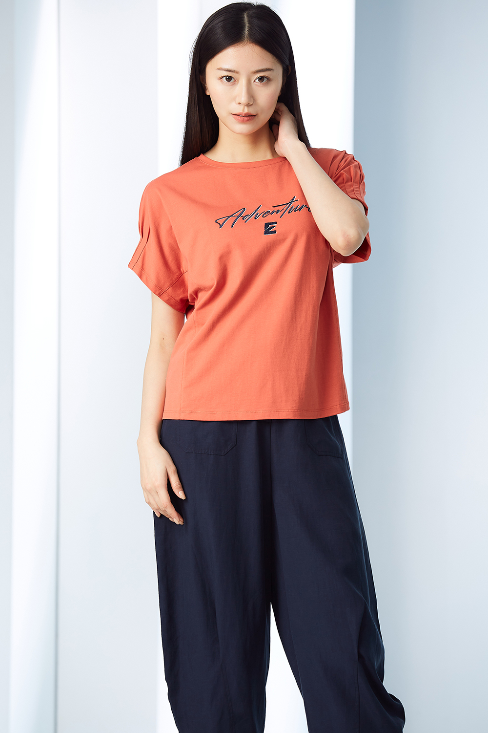 袖口立體抓褶,連袖棉質上衣。